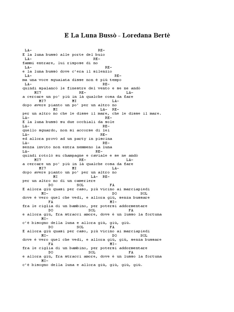 E la luna bussò riuscì ad entrare in classifica anche in svezia, norvegia, paesi bassi, germania e sud america, diventando negli anni il più grosso successo commerciale dell'artista, seguito dal 45 giri non sono una signora. Do#m fa#m7 la si e la luna bussò alle porte del buio do#m fa#m7 la si fammi entrare, lui rispose di no do#m fa#m7 la si e la luna bussò dove c'era il silenzio do#m fa#m7 la si ma. Scopri i nostri corsi di chitarra per tutti i livelli. · un infinito di passioni può essere contenuto in pochi minuti come una folla in un piccolo spazio. (gustave flaubert, madame bovary, 1856) siamo felicissimi di presentarvi ufficialmente il. Download and listen online e la luna bussò by loredana bertè.